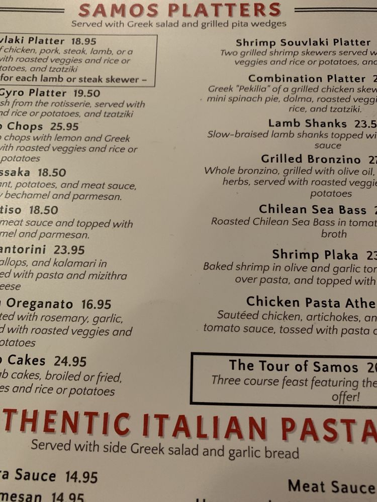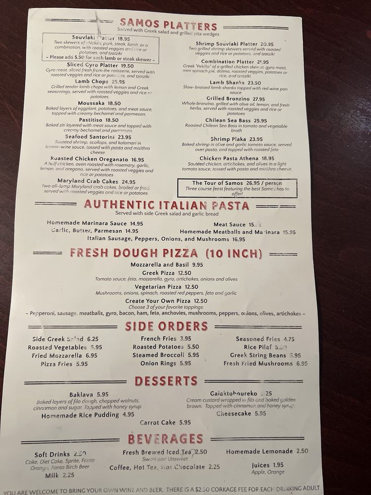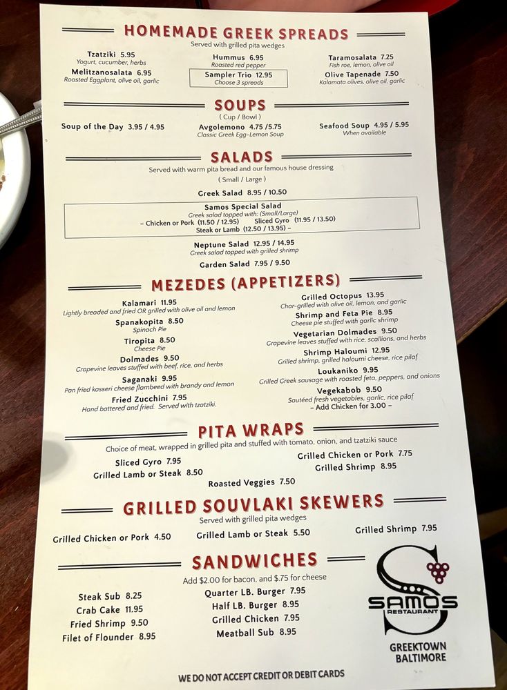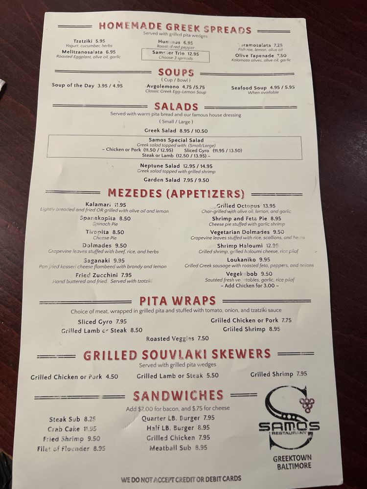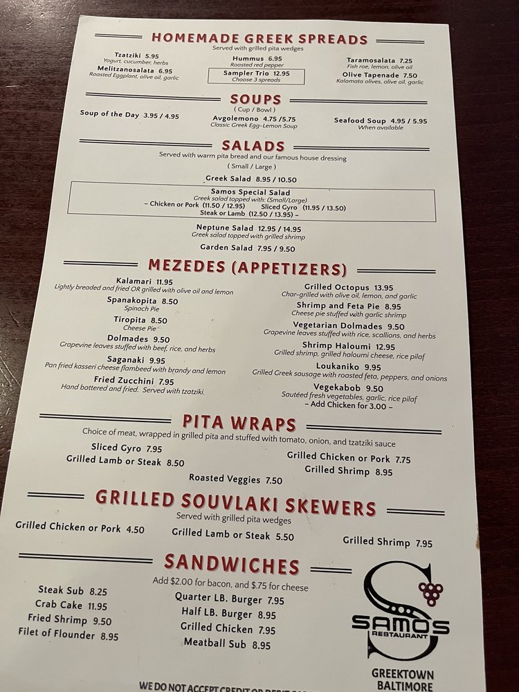 Samos Restaurant, a Greek sandwich haven located in Baltimore, offers a wide array of traditional Greek dishes. From Avgolemono soup to Neptune Salad with grilled garlic shrimp, the menu is filled with flavorful options. The mezedes/appetizers, such as Dolmades and Grilled Octopodi, are must-tries according to customers. The gyros, souvlaki platter, and baklava have received high praises for their taste and generous portions. The ambiance, described as old but unique, adds to the dining experience. With friendly service and BYOB option, Samos Restaurant provides a cozy and familial atmosphere for guests. Don't miss out on the delicious Greek cuisine and welcoming vibes at Samos Restaurant.